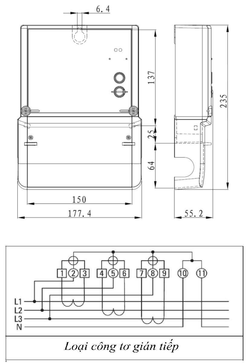 Sơ đồ đấu dây và kích thước công tơ điện tử 3 pha ME-43