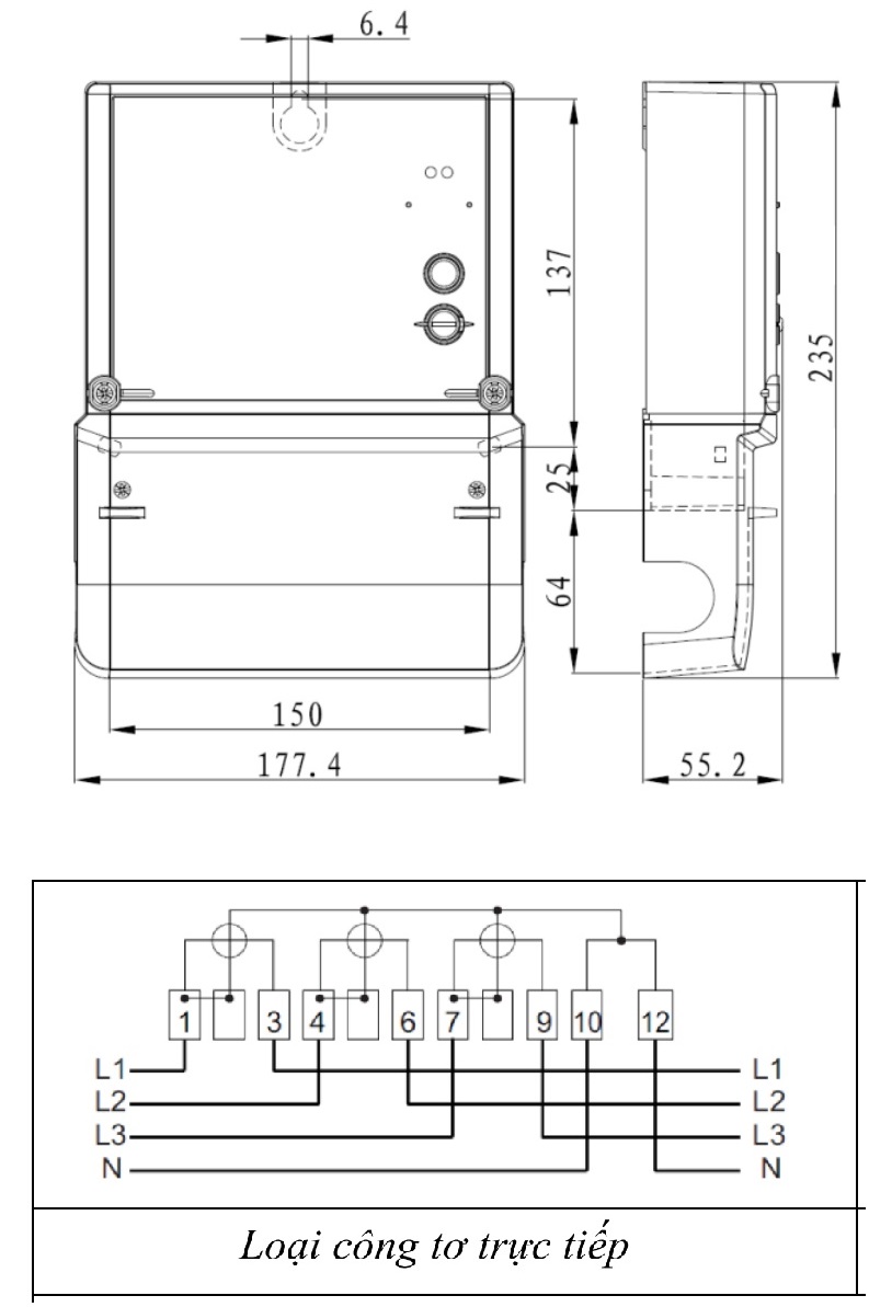 Sơ đồ đấu dây và kích thước công tơ điện tử 3 pha ME-43
